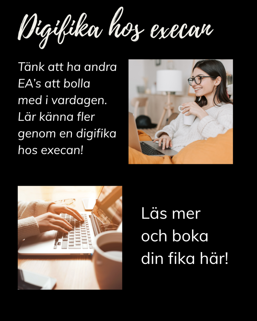 Välkommen till execans digitala universum! Vi arrangerar utbildningar, workshops, webinarer, nätverksträffar, AWs… Ja, allt som är intressant och roligt! Som medlem väljer du vad som passar dig. En del arrangemang är även öppna för dig som ännu inte är medlem. För att kunna erbjuda så mycket som möjligt till så många som möjligt arrangerar vi främst digitala event, även om vi ibland ses fysiskt som lite grädde på moset. Längre ner ser du vad som är på gång just nu!